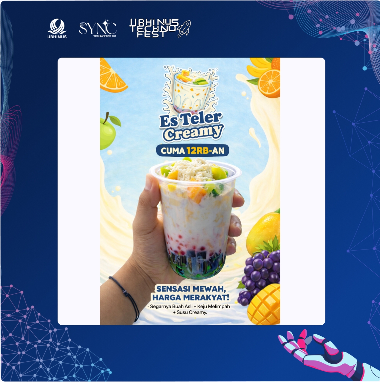 Es teler adalah salah satu minuman khas Indonesia yang sangat populer karena rasa segar dan perpaduan bahan-bahan tropisnya. Dengan kombinasi warna buah yang menarik dan rasa yang kaya, es teler bukan hanya menggugah selera tetapi juga menjadi simbol kekayaan kuliner nusantara yang memadukan kesegaran alami buah tropis dengan cita rasa tradisional Indonesia.